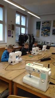 Dann wurde uns erklärt, was wir herstellen können. Wir konnten eine Karte basteln, auf Papier nähen und ein Buch binden. Mit Aquarellfarben und viel Fantasie tuschen wir tolle Bilder. Beim Nähen musste man zuerst ein Blatt falten und den Stoff aussuchen. Danach schnitten wir Dreiecke aus und nähten sie auf die Karte.