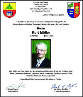 Im Januar erhielten wir die Nachricht, dass Kurt Möller im Alter von 90 Jahren verstorben ist. Der Bürgermeister unserer Partnergemeinde Neudorf-Bornstein, Christof Arp teilte uns mit, dass Kurt nach langer schwerer Krankheit auf dem heimischen Hof eingeschlafen ist.
