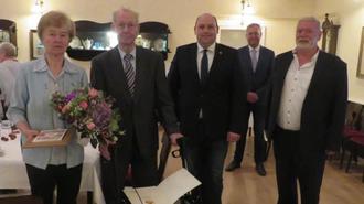 Foto aus SHZ „3. Okt. 2020 - Kurt Möller wird zum Ehrenbürger der Gemeinde Neudorf-Bornstein ernannt“. Kurt Möller (2. von links) freute sich mit seiner Frau Elke über die Ehrung im Beisein von (von links) Bürgermeister Christoph Arp, Amtsdirektor Matthias Meins und Karl-Heinz Schröder, stellvertretender Bürgermeister von Benz (Usedom).