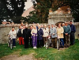 Kurt Möller in Mitten seiner Reisegruppe vor der Mellenthiner Kirche