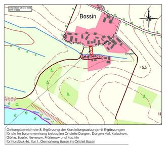 Der Entwurf der 8. Ergänzung der Klarstellungssatzung mit Ergänzungen für die im Zusammenhang bebauten Ortsteile Dargen, Dargen Hof, Katschow, Görke, Bossin, Neverow, Prätenow und Kachlin für Flurstück 46, Flur 1, Gemarkung Bossin mit Planzeichnung (Teil A), Text (Teil B) und Entwurf der Begründung in der Fassung von 12-2023 liegt nach § 3 Abs. 2 BauGB in der Zeit
