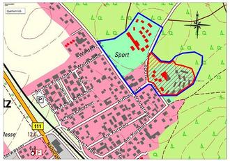Übersichtsplan mit Kennzeichnung des Bebauungsplangebietes Nr. 5 „Am Sportplatz“ (blaue Umrandung) und des Bebauungsplangebietes Nr. 24 „Hudewald Family Resort & SPA“ an der Straße Am Sportplatz (rot schraffierte Fläche)