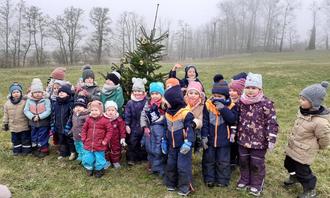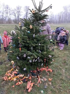 Auch unseren alten Tannenbaum haben wir wieder mit vielen leckeren Dingen für die Tiere geschmückt. Alle Kinder haben etwas für die Tiere mitgebracht z. B. Äpfel, Nüsse, Rüben, Brot, Körner, selbst hergestellte Meisenringe ... Nun können wir aus unserem Fenster die Hasen, Rehe und Vögel beim Fressen beobachten. Lasst es euch schmecken ...
