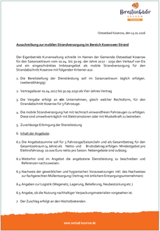 Der Eigenbetrieb Kurverwaltung schreibt im Namen der Gemeinde Ostseebad Koserow für den Saisonzeitraum vom 01.04. bis 30.09. der Jahre 2027 - 2030 den Verkauf von Eis und ein eingeschränktes Imbissangebot als mobile Strandversorgung für den Strandabschnitt Koserow mit folgenden Kriterien aus: