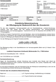 Gemäß § 31 Absatz 3 GeoVermG M-V wird den Beteiligten, denen die Grenzfeststellung und/oder Abmarkung nicht im Grenztermin oder schriftlich bekanntgegeben wurde, die Grenzfeststellung und/oder Abmarkung durch Offenlegung der Niederschrift über den Grenztermin bekanntgegeben.