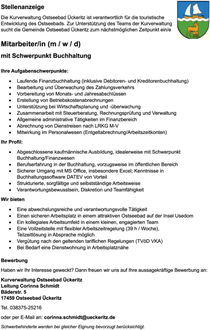 Die Kurverwaltung Ostseebad Ückeritz ist verantwortlich für die touristische Entwicklung des Ostseebads. Zur Unterstützung des Teams der Kurverwaltung sucht die Gemeinde Ostseebad Ückeritz zum nächstmöglichen Zeitpunkt ein/e