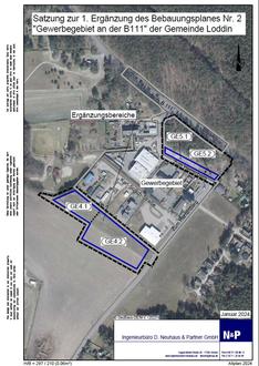 | Der Entwurf der 1. Ergänzung des Bebauungsplanes Nr. 2 „Gewerbegebiet an der B 111“ der Gemeinde Loddin von 11-2023 bestehend aus: | |