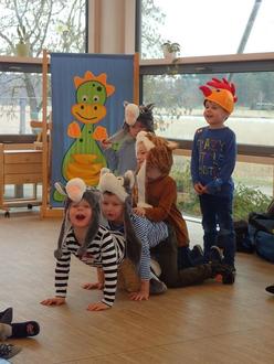 Nach dem Frühstück wurden wir mit einem Mitspieltheater im großen Sportraum überrascht bei dem wir uns verkleiden, singen und tanzen durften. Unter der theaterpädagogischen Anleitung spielten wir im Team als Höhepunkt das Märchen der Bremer Stadtmusikanten.