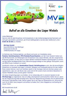 die MV-Rad GmbH, als Pilotprojekt den Einwohnern des Lieper Winkels, die das vorgenannte