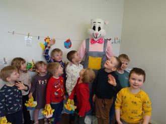 Wir hatten viel Spaß dabei. Gemeinsam sangen wir unsere Osterlieder. Plötzlich entdeckte Lucas den Osterhasen vorbei hoppeln. Alle waren sehr aufgeregt. Ob er vielleicht schon unsere Osterkörbchen versteckt hat? Und wo sollten wir suchen? Schnell machten sich alle Kinder auf den Weg, ein Osterkörbchen zu finden. Der Osterhase hatte sich tolle Verstecke für unsere Körbchen ausgesucht. So manches Körbchen wurde erst nach langem Suchen gefunden. Als der Osterhase dann noch zu uns kam, gab es ein großes Hallo, aber auch Zurückhaltung. Danke, lieber Osterhase, dass hast du toll gemacht.