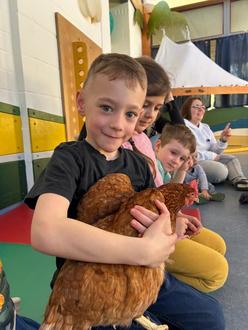 Ein besonderes Highlight war der Besuch zweier Hühner im Morgenkreis. Hier konnten sich die Kinder die gefederten Tiere einmal genauer anschauen und sogar streicheln.
