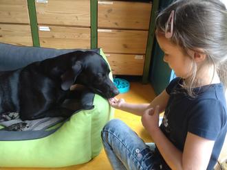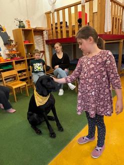 Um unseren tierbegeisterten Kindern im Kinderhaus regelmäßig tierischen Kontakt zu ermöglichen, können wir neben den Hühnern auch auf unseren Kinderhaus-Hund Oskar nicht verzichten! Oskar ist schon lange ein treuer Begleiter unserer Erzieherin Frau Kurze, die vor einigen Jahren auch eine Ausbildung mit dem 8 jährigen Labrador-Weimaraner Mix zum Therapiehund absolviert hatte. Die Kinder freuen sich immer sehr auf seine wöchentlichen Besuche, bei denen der Umfang und die inhaltliche Gestaltung variieren. Sei es die reine Anwesenheit des Hundes oder die aktive Teilnahme am Kindergartenalltag, in der die größeren Kinder sogar ihren Hundeführerschein ablegen konnten.