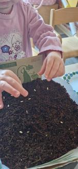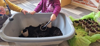 Nachdem wir den Winter aus dem Haus vertrieben haben, ging es mit großem Elan in die Frühlingszeit. Vom Ausästen der Bäume im Dorf haben wir uns Kastanien- und Apfelzweige ins Haus geholt. Und wir konnten beobachten wie schnell sich aus den Knospen der Kastanie nach 3 Tagen erste winzige Blätter und nach 1 Woche schon die ersten Blütenstände zeigten. Die Apfelzweige brauchten viel länger. Aber nun wollten wir mit einem Indoor-Anzuchtset noch viel mehr entdecken. Wir hatten Gurken-, Salat- und Tomatensamen im Set und somit waren die Unterschiede deutlich sichtbar. Die Gurkensamen waren groß genug, damit die Buddelmäuse sie alleine einsetzen konnten. Die anderen haben wir gemeinsam eingestreut. Nach 3Wochen haben wir sie einzeln in kleine Töpfe umgepflanzt. Nun gießen wir sie fleißig, damit sie Groß und Kräftig werden und ins Freie kommen. Mal sehen, wie viele es werden! In der Zwischenzeit basteln, malen und singen wir uns rein in die Osterzeit.