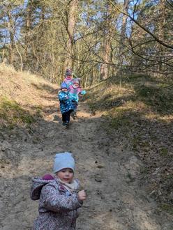 Dann geht es erstmal rein in den Wald. Gleich zu Beginn schauten wir uns am selben Strauch wie letzte Woche die Blattknospen an. Tatsächlich sind sie schon wieder etwas gewachsen. Wir haben die Knospen in der vorigen Woche fotografiert und können das Foto nun super vergleichen. Wir sehen jetzt deutlich den Unterschied. Dann sind wir alle ganz still und hören die Vögel zwitschern. Im Winter war es ganz schön still in diesem Moment. Aber was ist das? Wir hören etwas klopfen. Es ist tatsächlich ein Specht. Zum ersten Mal in diesem Jahr. Leider können wir ihn nicht entdecken. Das zweite Highlight ist unser „Crosserberg“. So nennen wir ihn nämlich. Dort laufen wir hoch und runter, je nachdem wie viel Puste jeder hat.