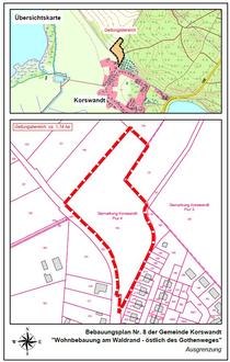 Die Gemeindevertretung der Gemeinde Korswandt hat in der öffentlichen Sitzung am 29.06.2023 für den in anliegender Übersichtskarte gekennzeichneten Geltungsbereich die Aufstellung des Bebauungsplans Nr. 8 „Wohnbebauung am Waldrand - östlich des Gothenweges“ beschlossen. Der Beschluss der Aufstellung des Bebauungsplans wird gemäß § 2 Abs. 1 BauGB hiermit bekannt gemacht.