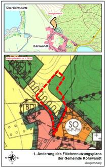 Die Gemeindevertretung der Gemeinde Korswandt hat in öffentlicher Sitzung am 29.06.2023 für den in anliegender Übersichtskarte gekennzeichneten Geltungsbereich die Aufstellung der 1. Änderung des Flächennutzungsplans beschlossen. Der Beschluss der Aufstellung der 1. Änderung des Flächennutzungsplans wird gemäß § 2 Abs. 1 BauGB hiermit bekannt gemacht.