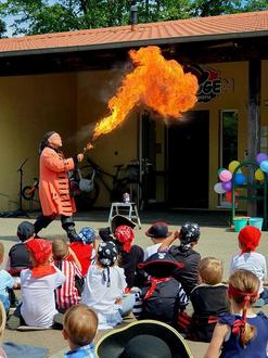 Zum Auftakt sangen alle kleinen Seeräuber gemeinsam ein extra einstudiertes Lied und eröffneten damit das Fest. Als Spezialgast sorgte der Piratenkäpt`n Chris de Flambö mit seiner sagenumwobenen Piratenshow für jede Menge Spaß und überraschte die Kinder und Eltern mit Seemannsliedern, nervenkitzelnder Feuerakrobatik und Spezialeffekten aus der Kanone. Bei Kuchen, Bratwurst und Getränken tanzten die Kinder bis in den frühen Abend, während sich Eltern und Erzieher ausgelassen austauschen konnten.