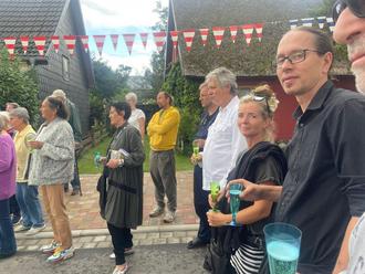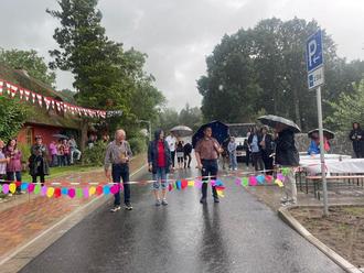 Mit einem symbolischen Scherenschnitt durch das Geburtstagskind Petra Sigmund, dem Anwohner Klaus Pieper und dem Vertreter des Landkreises VG, Ralf Rosenow, wurde die Straße eröffnet. Die Eröffnung wurde mit einem Glas prickelndem Sekt und einem kräftigen Regenschauer durch die Gäste bejubelt.