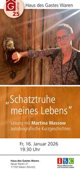 Tauchen Sie für eine Stunde ein in die Welt einer Frau, die vom Opfer zur Heldin ihres eigenen Lebens wird. Mit autobiografischen Kurzgeschichten, die berühren, entführen und mitreißen, öffnet die 1963 in Penzlin geborene Autorin und Hörbuchsprecherin Martina Massow die „Schatztruhe“ ihres Lebens.