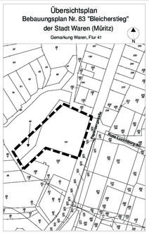 Auf Grund des § 10 des Baugesetzbuches (BauGB) in der Fassung der Bekanntmachung vom 3. November 2017 (BGBL. I, S. 3634), zuletzt geändert durch Art. 2 des Gesetztes vom 26.04.2022 (BGBl. I, S. 674), sowie nach § 86 der Landesbauordnung Mecklenburg - Vorpommern vom 15. Oktober 2015 (GVOBI. M-V 2015, S.344; 2016 S. 28). zuletzt geändert durch Gesetz vom 26.06.2021 (GVOBI. M-V S. 1033), hat die Stadtvertretung in der Sitzung am 29. Juni 2022 die Satzung über den Bebauungsplan Nr. 83,,Bleicherstieg" (im Übersichtsplan gestrichelt dargestellt) als Bebauungsplan der Innenentwicklung gemäß § 13a BauGB beschlossen. Diese besteht aus der Planzeichnung (Teil A) und dem Text (Teil B).