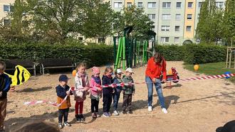 Am letzten Osterferientag hatte die WOGEWA viele Kinder zur Wiedereröffnung des Spielplatzes Am Stauffenbergplatz 21-29 eingeladen. Nach umfangreichen Sanierungsmaßnahmen von mehr als 30.000,- € sollte es nicht einfach so wieder los gehen, sondern der Vermieter wollte diese Aktion zu einem besonderen Erlebnis für die jüngsten Einwohner der Stadt machen. Pünktlich um 10 Uhr warteten die Kita- und Hortgruppen und auch viele Kinder aus den umliegenden Wohnhäusern darauf, die neuen Spielgeräte zu erkunden.