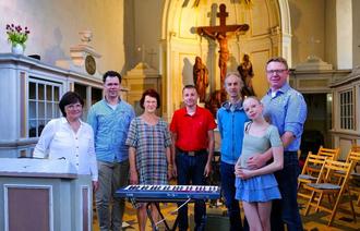 Petra Hakert (links) und Marcus Wenzel (3.v.r.) gemeinsam mit den Musikern: Jochen Lewitz, Jens Poguntke, Karin Günther, Johannes und Anna Vlach. Weiter Musiker sind Erik Mörke, Friedrich Drese und Volker Muchin