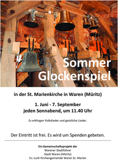Immer samstags vom 1. Juni bis zum 14. September 2024 sollten sich Interessierte jeweils ab 11:35 Uhr an der Marienkirche einfinden, um direkt dabei sein zu können. Natürlich ist das Glockenspiel auch in der Warener Innenstadt und darüber hinaus zu hören. Achten Sie mal darauf!