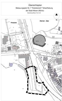 | 1. | Das Teilaufhebungsgebiet grenzt unmittelbar westlich an den historischen Stadtkern von Waren Müritz. Die Teilaufhebung umfasst in der Gemarkung Waren in der Flur 4 die Flurstücke 3/3 teilweise und 5/20 teilweise sowie in der Flur 63 die Flurstücke 1/21 teilweise, 1/23 teilweise,1/34 teilweise und 1/48 teilweise. Die Grenzen sind im Übersichtsplan gestrichelt dargestellt. |