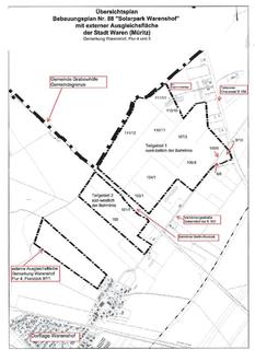 Die Stadtvertretung hat in der Sitzung am 17. Juli 2024 den Entwurf des Bebauungsplanes Nr. 88 „Solarpark Warenshof“ der Stadt Waren (Müritz) mit dem Entwurf der Plansatzung sowie dem Entwurf der Begründung, dem Umweltbericht und dem Blendgutachten gebilligt und zur öffentlichen Auslegung bestimmt.
