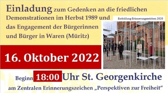 Anschließend findet ab 18:30 Uhr die Szenische Lesung „OKTOBERFRÜHLING 1989 – Kaleidoskop einer Revolution“ in St. Georgen statt. Den Abschluss bildet ca. 19:30 der „WEG DER KERZEN“ von St. Georgen über die Schulstraße, die Lange Straße und die Mariengasse zur Kirche St. Marien. Dort endet das Gedenken.