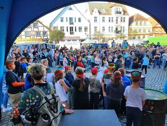 Wir, der Warener Innenstadt Verein, haben versucht, diesen Tag für die Warener Kinder zu einem Fest zu machen. Für die Kinder der Kollwitz-Grundschule begann der Tag mit einer Fahrt der Tschu-Tschu Bahn und mit den Bussen von Meck-Charter. Diese brachten die Kids in die Innenstadt. Um 9 Uhr begannen wir mit Kindern beider Warener Grundschulen unser Fest. Nach der Begrüßung gab es eine Runde Musik und dann wurden die Aufgaben an die Klassen verteilt.