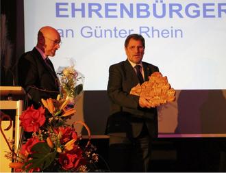 Zur Würdigung des außergewöhnlichen Engagements von Günter Rhein übergaben Bürgermeister Norbert Möller, der Präsident der Stadtvertretung Toralf Schnur sowie der Minister für Inneres und Bau des Landes Mecklenburg-Vorpommern, Christian Pegel, der eigens aus Schwerin angereist war, ihm die Urkunde der Ehrenbürgerschaft. Zusätzlich erhielt er eine der letzten Reliefdarstellungen der Stadt Waren (Müritz) des Keramikers Franz Poppe.