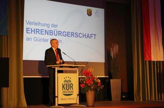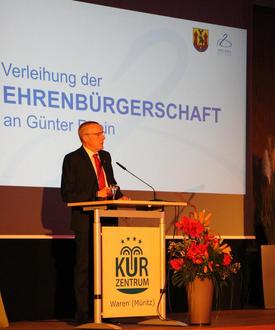 „„Waren ist schön“ ist eine Feststellung, die ich auch teile und die nach wie vor ihre Gültigkeit hat. Wer sich ein wenig in unserer Stadtgeschichte und Kommunalpolitik auskennt kann sich sicherlich vorstellen, warum ich gerade am Anfang meiner Laudatio genau diesen Satz nenne. Er steht unstrittig im Zusammenhang mit dem Wirken und Schaffen des ehemaligen Bürgermeisters unserer Stadt, dem heute zu Ehrenden Günter Rhein.