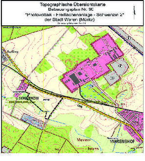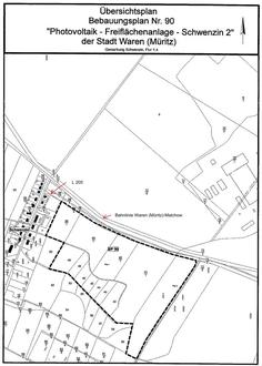 | 1. | Das Plangebiet befindet sich nordwestlich des Stadtgebietes der Stadt Waren (Müritz) und nördlich des Ortsteils Schwenzin. Es grenzt an die Landesstraße L 205 sowie an die Bahnlinie Waren (Müritz) - Malchow an. Das Plangebiet wird durch die Bahnlinie Waren (Müritz) - Malchow in zwei Teilgebiete geteilt. Das Plangebiet hat insgesamt eine Größe von ca. 12 ha. | |