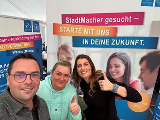 Firma Eggersmann öffnete am 12. Oktober erneut die Türen zur Berufs- und Ausbildungsmesse. Die Besucherinnen und Besucher konnten Gespräche mit den zahlreichen und lokalen Vertretern der Unternehmen führen und sich zu den Karrieremöglichkeiten informieren, aber auch praktische Einblicke in die beruflichen Tätigkeiten erhalten. Auch wir als Stadt Waren (Müritz) präsentierten uns als Ausbildungsstätte und gaben einen Einblick in die verschiedenen Ausbildungsberufe. Es konnten Fragen zu unseren Aufgabenbereichen und dem Beruf der(s) Verwaltungsfachangestellten sowie Straßenwärter(in) gestellt und beantwortet werden. Weiterhin haben wir angeboten, ein Praktikum bei uns zu absolvieren, um einen genaueren Eindruck von der Verwaltungsarbeit zu bekommen.