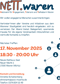 Seit einem halben Jahr wächst in Waren (Müritz) ein neues Netzwerk, das Menschen und Organisationen miteinander verbindet, die sich für ein lebendiges und gemeinschaftlich gestaltetes Miteinander in der Stadt einsetzen. NETT.waren – Netzwerk für Engagement, Toleranz und Teilhabe in Waren.