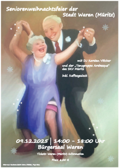 Seniorenweihnachtsfeier der Stadt Waren (Müritz) mit DJ Karsten Völcker und der „Tanzgruppe Arabesque“ des SKV Müritz inkl. Kaffeegedeck 09.12.2025 | 14:00 - 18:00 Uhr Bürgersaal Waren Tickets: Waren (Müritz)-Information Preis: 6,00 € ©Kur-und Tourismus GmbH Waren (Müritz) | Finja Selau