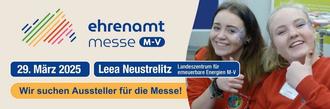 Wir freuen uns über Ihre Unterstützung und Teilnahme und hoffen, viele neue Aussteller auf der EhrenamtMesse am 29. März 2025 in Neustrelitz begrüßen zu dürfen.