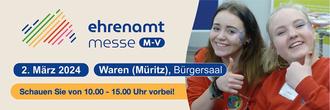 Am 2. März 2024 von 10:00 Uhr bis 15:00 Uhr öffnet unsere 17. EhrenamtMesse im Bürgersaal Waren (Müritz) ihre Türen. 48 Vereine, Verbände, Institutionen und Initiativen präsentieren sich und ihr freiwilliges Engagement der Öffentlichkeit. Frauke Hilgemann, Abteilungsleiterin Soziales und Integration im Ministerium für Soziales, Gesundheit und Sport eröffnet die EhrenamtMesse nach dem musikalischen Auftakt der Malchower Spielleute e.V..