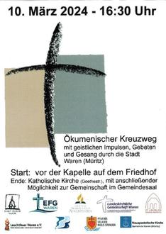 Am Aschermittwoch beginnt für Christen die Fastenzeit, in der sie sich traditionell auf Ostern und damit auf das Fest der Auferstehung Jesu vorbereiten. Eine Zeit des Fastens ist in allen Weltreligionen zu finden. Wie im vergangenen Jahr wollen die neun christlichen Gemeinden der Stadt Waren (Müritz) – Ev. Mariengemeinde, Ev. Georgengemeinde, Kath. Gemeinde Seliger Niels Stensen, Neuapostolische Gemeinde, Gemeinde der Sieben-Tags-Adventisten, Baptisten, Leuchtfeuergemeinde, Internationale Gemeinde und die Landeskirchliche Gemeinschaft - am 10. März 2024 ab 16.30 Uhr bei einem Kreuzweg durch die Stadt den Worten der Seligpreisungen in Gebet und Meditation nachspüren. Was sagen sie uns in der heutigen Zeit, in welcher Beziehung stehen sie zum Kreuz, wie können sie uns Halt und Orientierung sein? Der Kreuzweg startet vor dem Friedhof und endet in der katholischen Kirche. Alle Bürgerinnen und Bürger sowie Gäste der Stadt sind herzlich eingeladen, diesen Kreuzweg auf sieben Stationen mitzugehen, gemeinsam einen kurzen Zeitraum der Fastenzeit anders zu erleben, die positive Botschaft der Seligpreisungen und des Kreuzes zu erfahren.