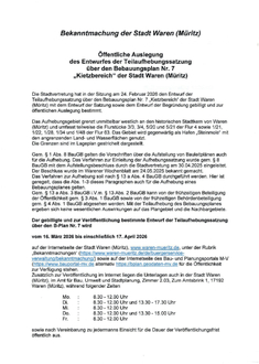 Zusätzlich zur Veröffentlichung im Internet liegen die Unterlagen auch in der Stadt Waren (Müritz), im Amt für Bau, Umwelt und Stadtplanung, Zimmer 2.03, Zum Amtsbrink 1, 17192 Waren (Müritz), während folgender Zeiten