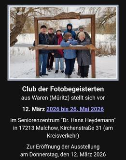 Vom 12. März bis 26. Mai 2026 in Seniorenzentrum, „Dr. Hans Heydemann“ in 17213 Malchow, Kirchenstra0e 31 (am Kreisverkehr). Der Club zeigt, was aus der Initiative von Wolfgang Albrecht (gest. 2019), dem ehemaligen Geschäftsführer der Wohnungsgenossenschaft Waren e.G. – einen Fotoclub zu gründen – geworden ist. Der Fotoclub hat zur Zeit 17 Mitglieder. 14 davon sind mit ihren Fotos – in einer Skala von Natur- bis Landschaftsfotografie – in dieser Ausstellung vertreten.
