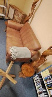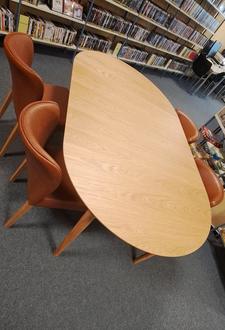 Im letzten Jahr kamen einige neue Möbel in Warens schöner Bibliothek an. Eine bequeme und zum Verweilen einladende Couch mit 2 Beistelltischen mit Glasplatte sowie 4 kleine Holzhocker. Der große Bürotisch mit den dazu passenden Stühlen wurde durch einen abgerundeten Holztisch mit 4 Stühlen, in derselben Optik wie die Couch, ersetzt.
