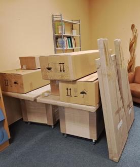 In den großen Kartons befinden sich neue Regale für den Medientreff. Es besteht dann die Möglichkeit, da sich Rollen an den Füßen der Regale befinden, diese leichter von einem Ort zu anderen zu bewegen.