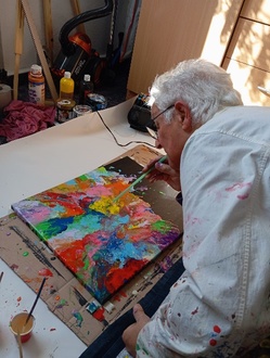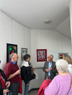 Horst Hien malt nicht nur mit Pinsel. Auch ungewöhnliche Hilfsmittel wie Nudelholz und Folie kommen bei ihm zum Einsatz. Seine Motive sind so vielfältig wie seine Techniken - von leuchtenden Sommerblumen über fantasievolle Werke zur Ernte- und Eiszeit bis hin zur „Harmonie der Farben“, einem Werk, das mit Fließtechnik gestaltet wurde. Besonders ans Herz gewachsen sind ihm seine Werke zu afrikanischen Themen: Elefanten, Giraffen und kunstvolle Masken spiegeln seine Faszination die fremde Kultur wider, die das Ehepaar während einer Reise nach Südafrika kennenlernen konnte. Ehefrau Lisa Hien bereichert die Ausstellung mit liebevoll bemalten Steinen - kleinen Kunstwerken, die in ihrer Schlichtheit begeistern und die Ausstellung abrunden. Ein besonderes Highlight wartet in der vierten Etage: Dort zeigt Horst Hien anschaulich die Entstehung eines Bildes - Schritt für Schritt erklärt er seinen kreativen Prozess und gewährt den Besucherinnen und Besuchern einen Einblick in seine Malerei. Als ganz persönliches Extra hat er sogar einige seiner Malutensilien ausgestellt - darunter seinen Malkittel, die Mischpalette, Pinsel und verwendete Farben - die einen authentischen Blick hinter die Kulissen seines kreativen Schaffens ermöglichen.