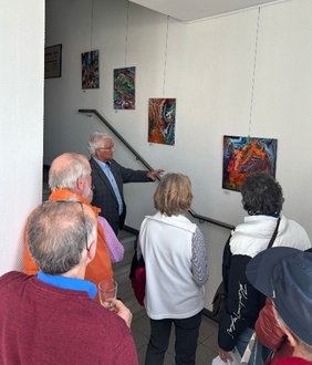 Die Eröffnung wurde von Sarah Semrau am E-Piano musikalisch begleitet. Zahlreiche Gäste waren gekommen - Familie, Freunde, Nachbarn, Bekannte, aber auch Kolleginnen und Kollegen aus der Stadtverwaltung, um die Arbeiten des Wareners zu bestaunen. Der Bürgermeister Norbert Möller begrüßte die Anwesenden mit herzlichen Worten und würdigte das kreative Engagement des Rentners, der mit viel Hingabe und Experimentierfreude seine künstlerischen Ideen verfolgt. Anschließend sprach Horst Hien selbst über seinen Weg zur Malerei: Während der Pandemie begann er, mit Farben zu experimentieren - zunächst unsicher, wie man Farben mischt, verdünnt und kombiniert. Doch schon bald entstand sein erstes Bild mit dem Titel „Gefühl für Farben bekommen“. Ein Werk, das den Auftakt zu einer beeindruckenden Reise markierte. Nach dieser Einführung ging es auf einen gemeinsamen Rundgang durch die Ausstellung - von der ersten bis zur vierten Etage. Es sind insgesamt 50 Bilder zu sehen, begleitet von persönlichen Erläuterungen des Malers zu Entstehung und Technik.