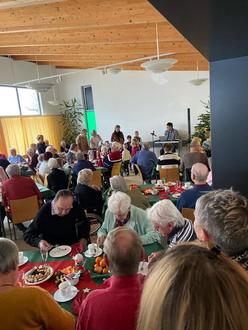 Die Bürgermeisterin, Jana Böckmann, lud die Seniorinnen und Senioren der Gemeinde zur Weihnachtsfeier ein. Mit einer überwältigenden Teilnehmerzahl von ca. 100 war die Kapazität des Raumes im Sportpark ausgeschöpft. Viele fleißige Helfer hatten die Tische festlich eingedeckt und unsere Gäste konnten sich bei weihnachtlicher Musik von Herrn Ziggel den Kuchen von „ Kell ́s Bauernmarkt“ schmecken lassen.