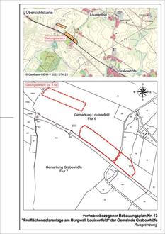 Die Gemeindevertretung der Gemeinde Grabowhöfe hat mit Beschluss vom 03.12.2024 den Entwurf des vorhabenbezogener Bebauungsplan Nr. 13 „Freiflächensolaranlage am Burgwall in Louisenfeld“ in der Fassung vom November 2024 einschließlich der Begründung mit dem Umweltbericht gebilligt und zur Veröffentlichung im Internet bestimmt.