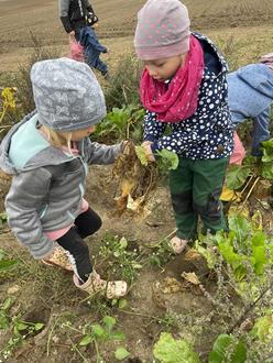 Matthias Kagel nahm die Kinder dann mit auf den Rübenacker, wo auch Muskelkraft gefragt war beim Ernten der Rüben, da musste doch schon kräftig gezogen werden. Gleich war der Wettkampf eröffnet, wer hat die größten Rüben gezogen.
