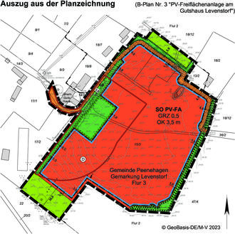 Die Gemeindevertretung Peenehagen hat in ihrer Sitzung am 05.12.2023 den geänderten Entwurf der Satzung über den vorhabenbezogenen Bebauungsplan (B-Plan) Nr. 3 „PV-Frei-flächenanlage am Gutshaus Levenstorf“, bestehend aus der Planzeichnung (Teil A) und den textlichen Festsetzungen (Teil B), sowie die Begründung mit dem Umweltbericht und den Anlagen gebilligt. Außerdem wurde der Beschluss zur Durchführung der Öffentlichkeits- und Behördenbeteiligung zum geänderten Entwurf des vorhabenbezogenen B-Planes Nr. 3 gefasst.